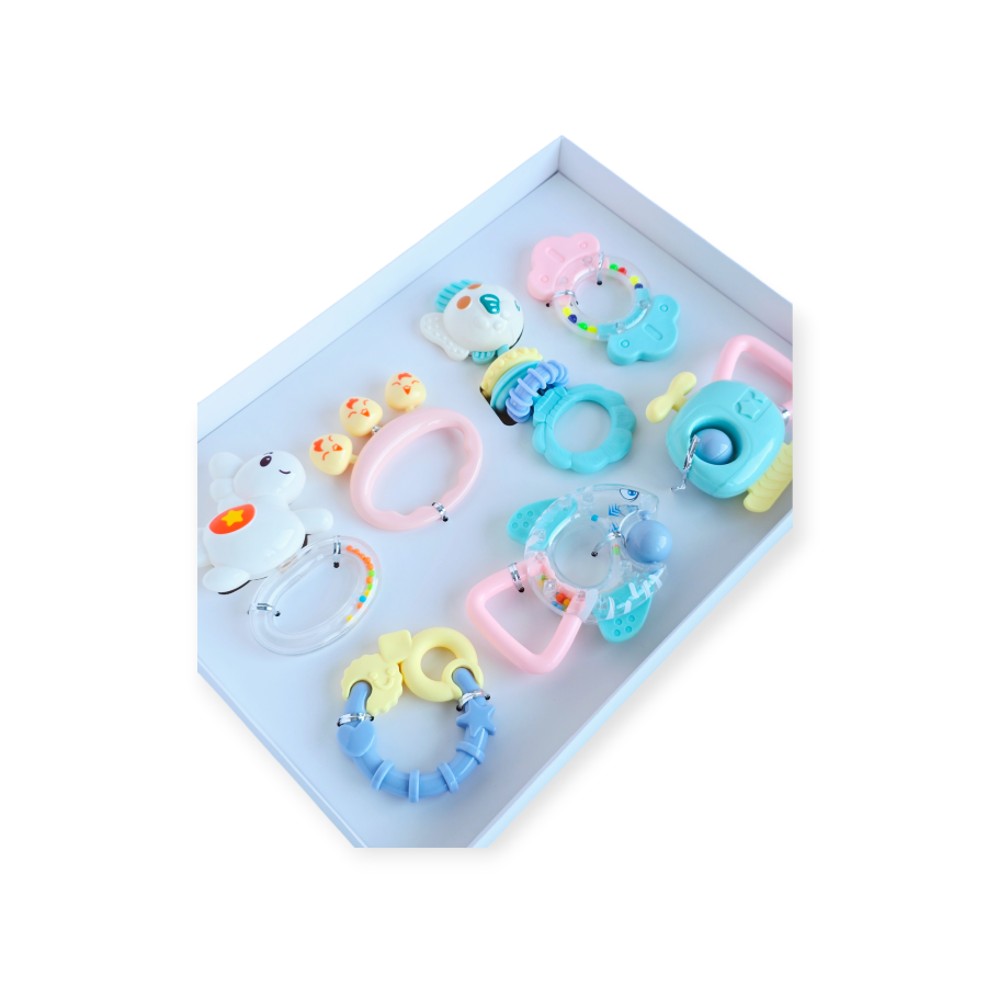 - Rinkinio sudėtis: 7 skirtingi barškučiai ir kramtukai
