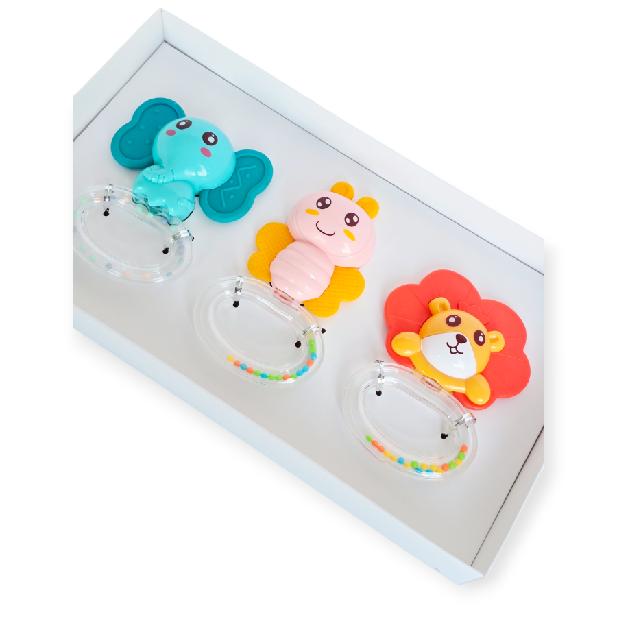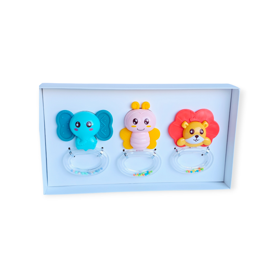 Šis spalvingas ir žavus 3 barškučių rinkinys yra idealūs sensoriniai žaislai kūdikiams nuo pirmųjų gyvenimo mėnesių. Rinkinį sudaro 3 mieli gyvūnai: dramblys, bitė, liūtas. Pagaminta iš saugių medžiagų ir skirti lavinti vaiko pojūčius.