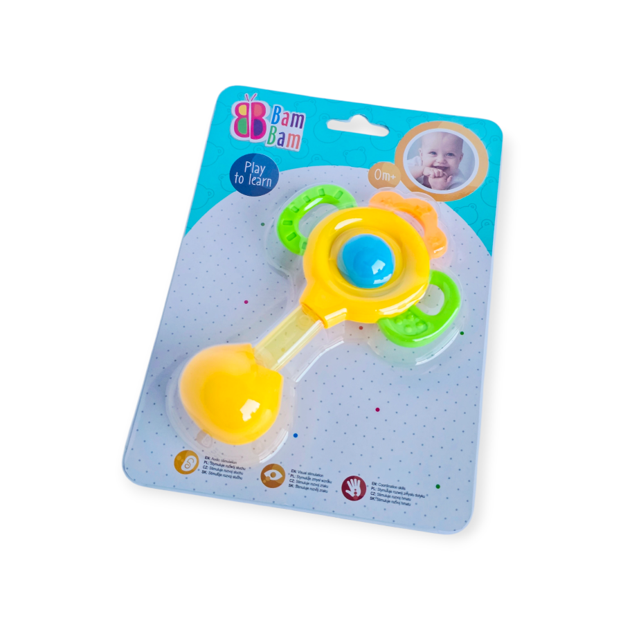 Ryškių spalvų barškutis, kuris skatina jūsų mažylį žaisti, lavina jo regėjimą, klausą ir motorinius įgūdžius.