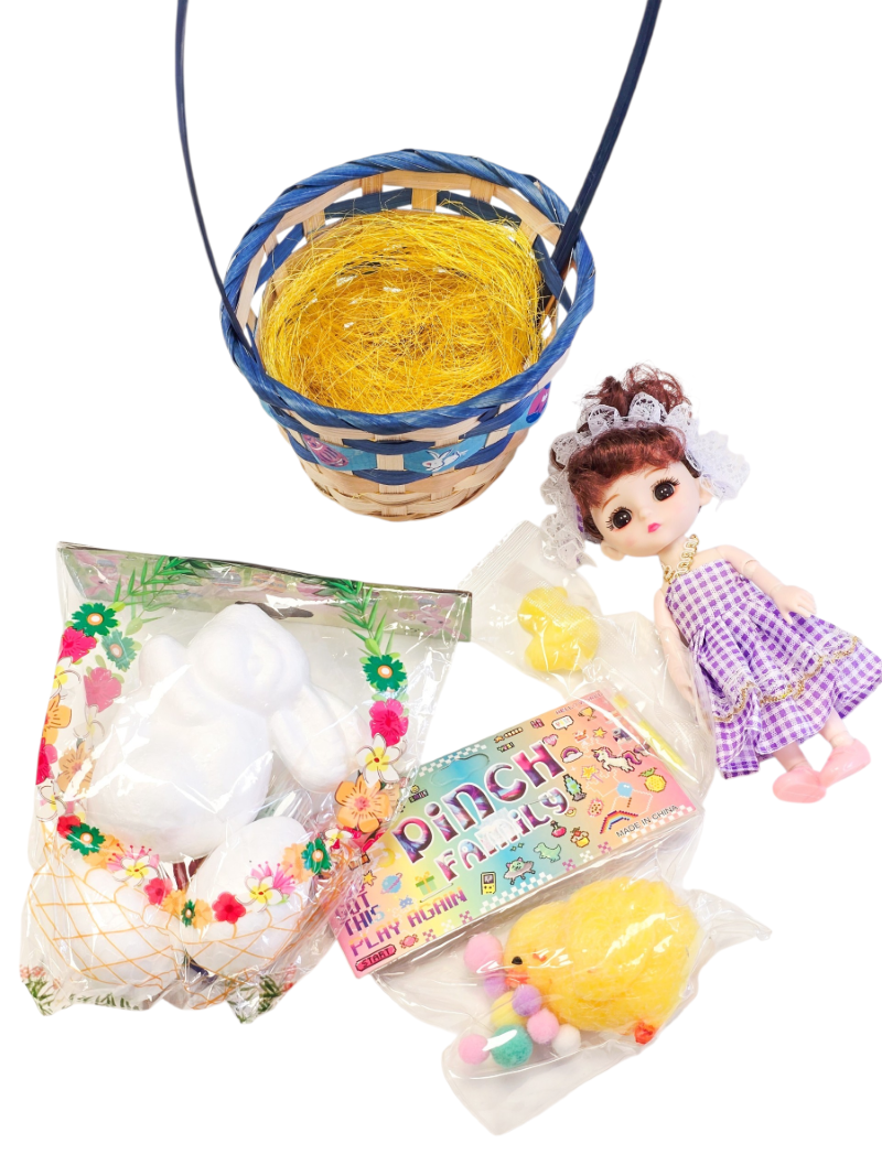 Rinkinys sudėtis į pintą krepšelį, kurį vėliau galima panaudoti susidėti margučius arba kitas smulkmenas.