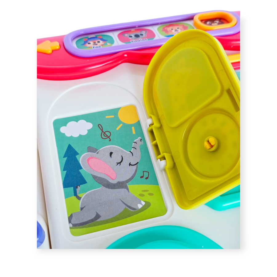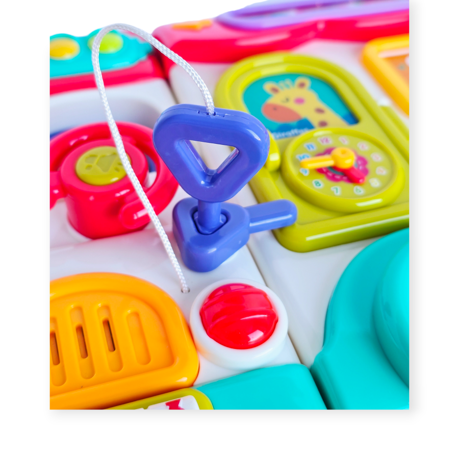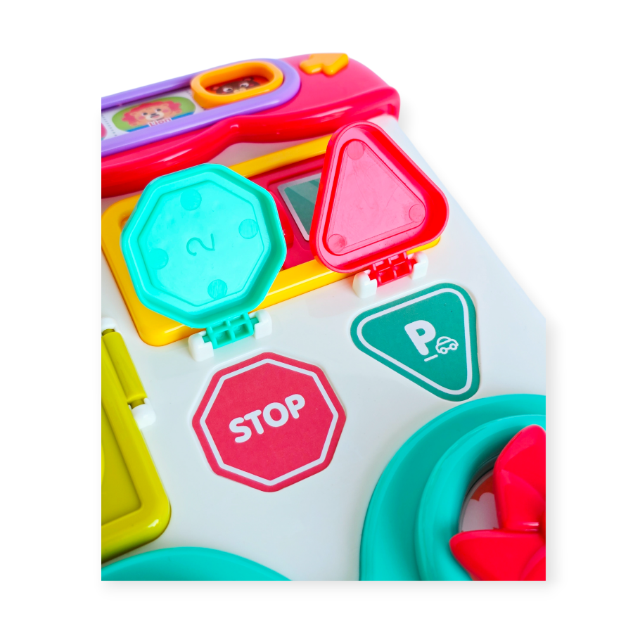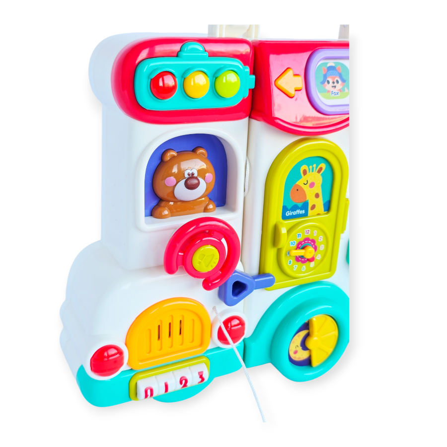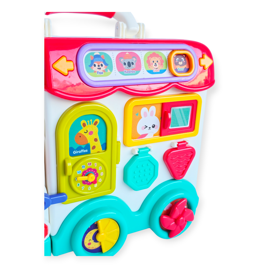 Interaktyvus edukacinis autobusas yra daugiafunkcis žaislas, kuriame sujungta edukacinė panelė, rūšiavimo įrankis, pianinas ir rankinis elementai, skatinantys vaiko vystymąsi per žaidimą. Su spalvingais mygtukais, stumdomais elementais, durelėmis, besisukančiais ratukais ir judančiomis figūrėlėmis mažyliai gali atrasti garsų, šviesų ir formų pasaulį.