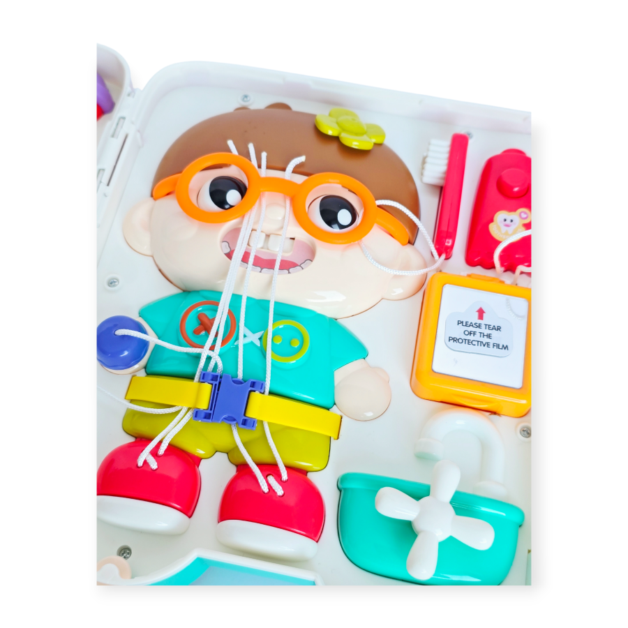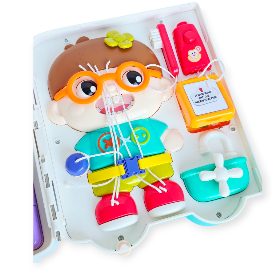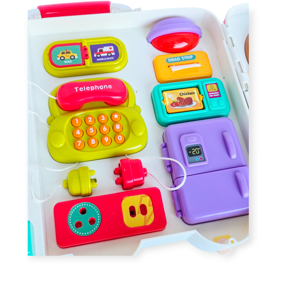 Šis žaislas siūlo įvairių veiklų, kurios lavina smulkiąją motoriką, akių ir rankų koordinaciją bei loginį mąstymą. Vaikai gali žaisti su telefonu, atidaryti šaldytuvą, naudotis čiaupu, derinti formas ir spaudyti šviečiančius mygtukus, kurie skleidžia linksmus garsus. Autobusas gali būti naudojamas pastatytas vertikaliai arba išskleistas kaip lagaminas, todėl jį lengva laikyti ir žaisti bet kur.