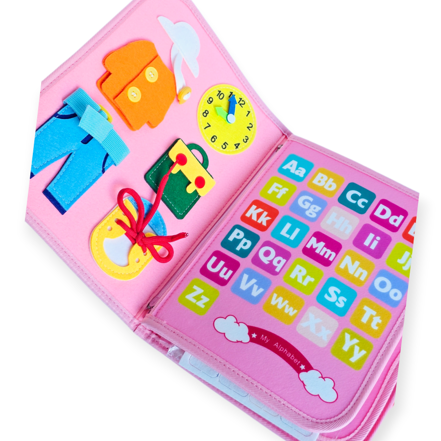 Motorinių įgūdžių ir savarankiškumo ugdymas — Montessori sensorinė knyga: sagtys, sagos, užtrauktukai, lipdukai ir raišteliai moko kasdienių veiklų.