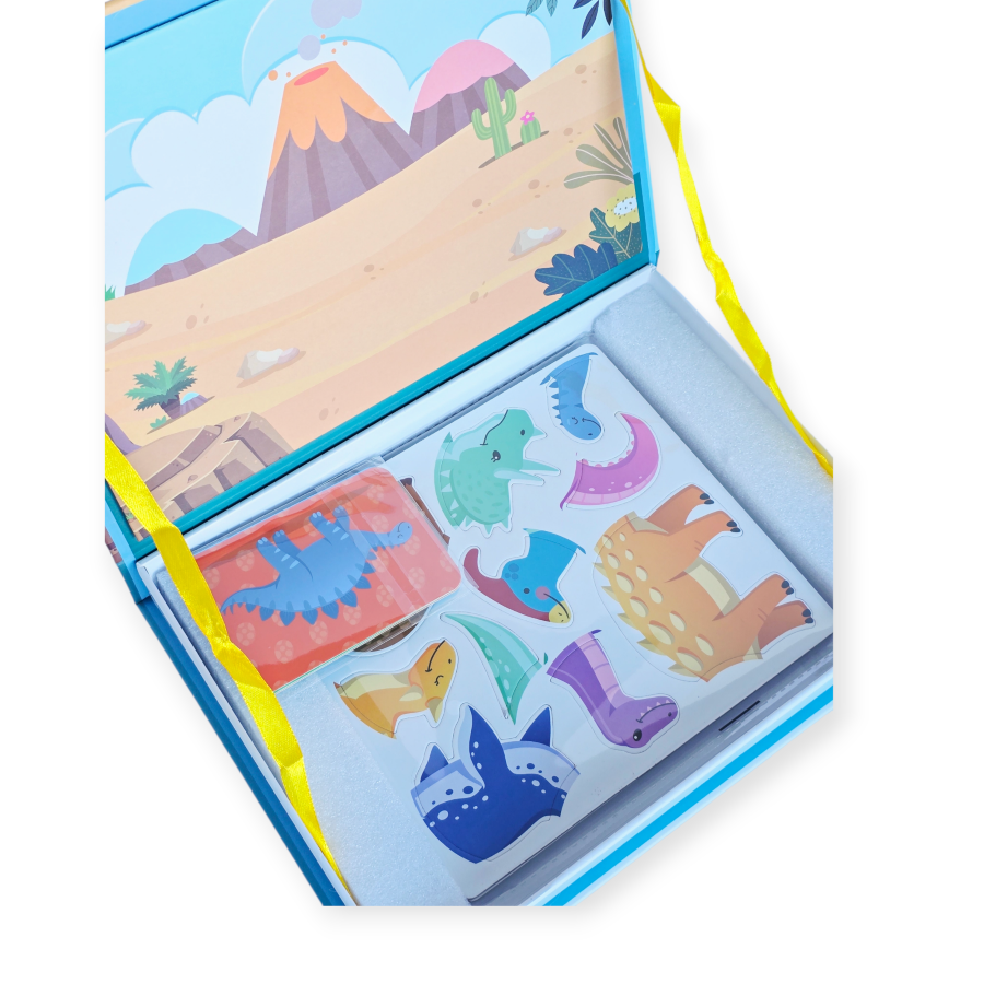 Šio rinkinio magija slypi magnetiniuose lipdukuose, kurie lengvai prilimpa prie pridedamos magnetinės lentos, todėl vaikai gali lengvai surinkti savo šedevrus dinozaurų tematika.