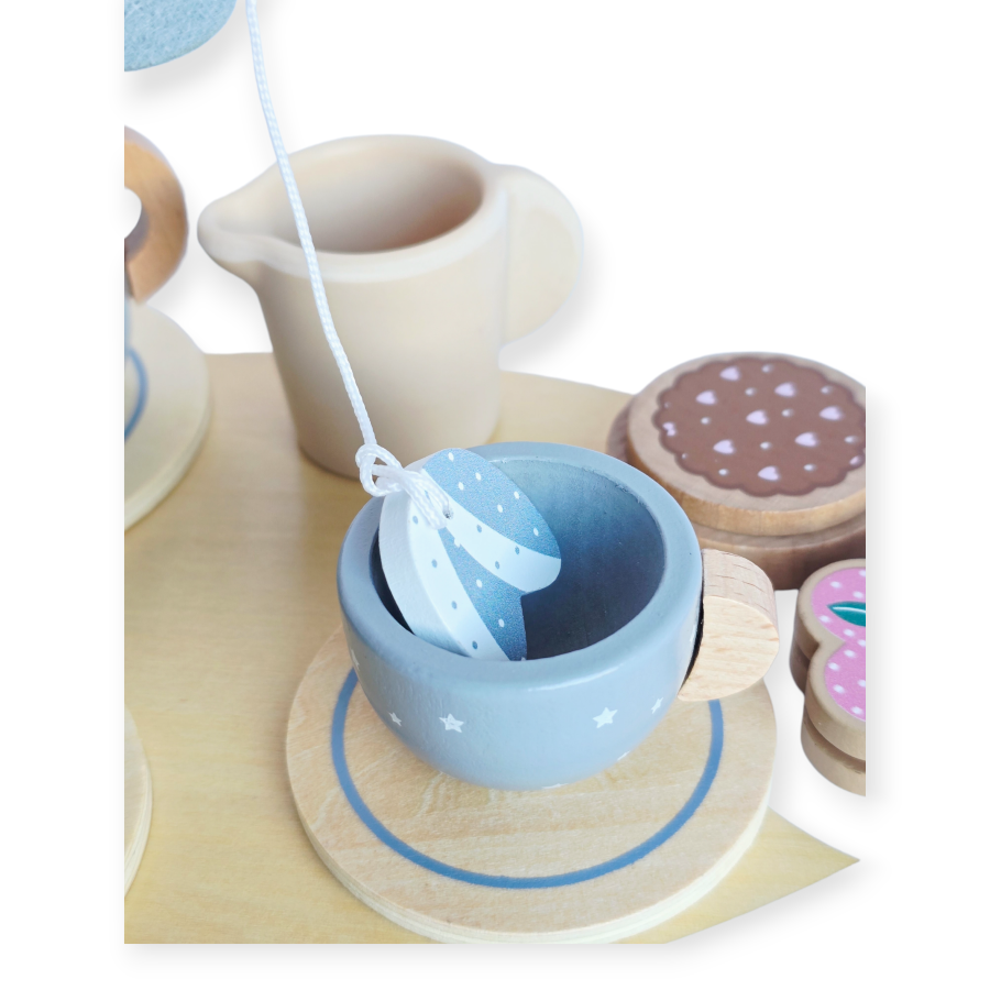 Virdulys su dangčiu, pieno ąsotis, puodeliai su lėkštutėmis, šaukšteliai, sausainiai, citrinos griežinėlis, arbatos maišelis ir padėklas su rankenomis užtikrina ilgas kūrybiško žaidimo valandas.