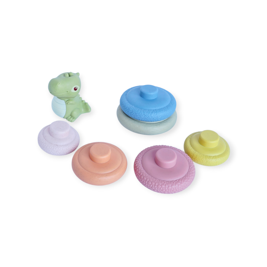 Rinkinį sudaro šeši minkšti apskritimai, pagaminti iš ekologiškų medžiagų, kurių kiekvienas yra skirtingos struktūros ir tekstūros. Įvairios tekstūros suteikia vaikams įvairių lytėjimo stimulų, stimuliuoja jų lytėjimo pojūtį ir pažintinį smalsumą. Dėl detalių dėjimo viena ant kitos lavinama rankų miklumas, akių ir rankų koordinacija bei loginis mąstymas. Papildomas žaislo elementas yra dinozauro figūrėlė, esanti piramidės viršuje, kuri, paspaudus, skleidžia cypiantį garsą, skatinantį sąveiką.