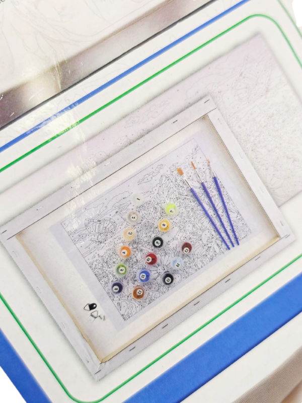 Tapybos rinkinys pagal skaičius, kuriame yra drobė ant porėmio su piešinuku "Katinas", dažai ir teptukai.