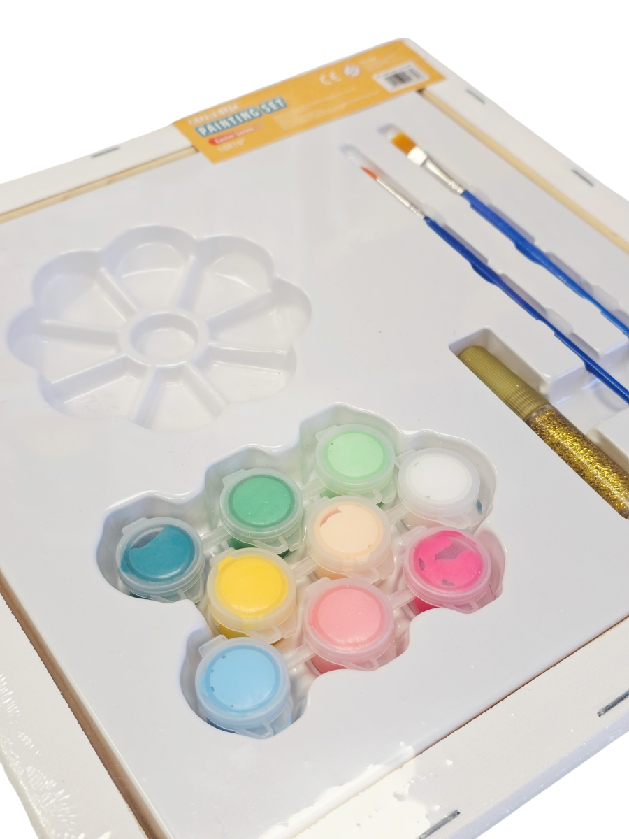 Tapybos rinkinys, kuriame yra drobė ant porėmio su piešinuku Velykų tema, dažai ir teptukai.