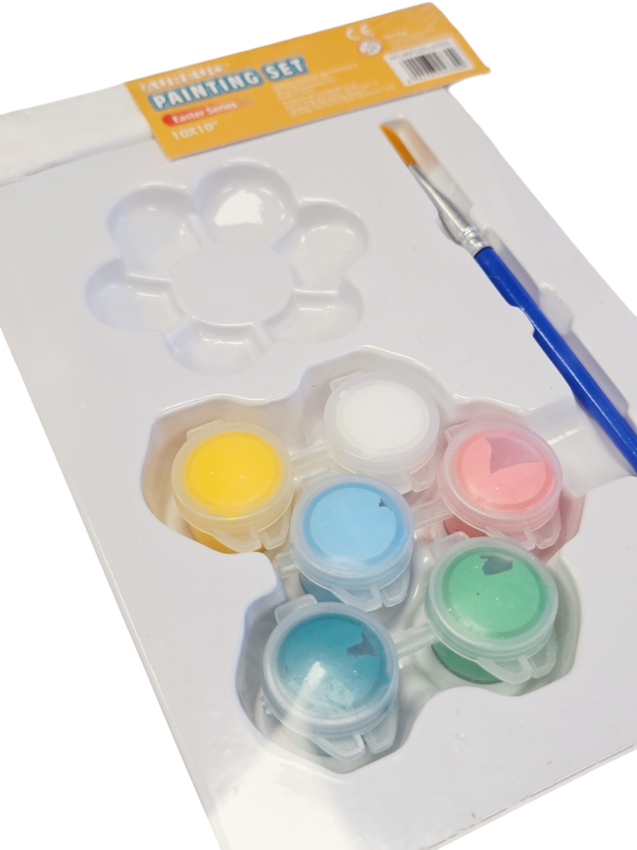 Tapybos rinkinys, kuriame yra drobė ant porėmio su piešinuku Velykų tema, dažai ir teptukas.
