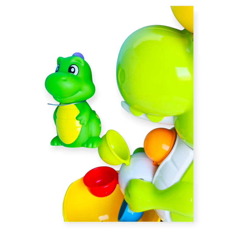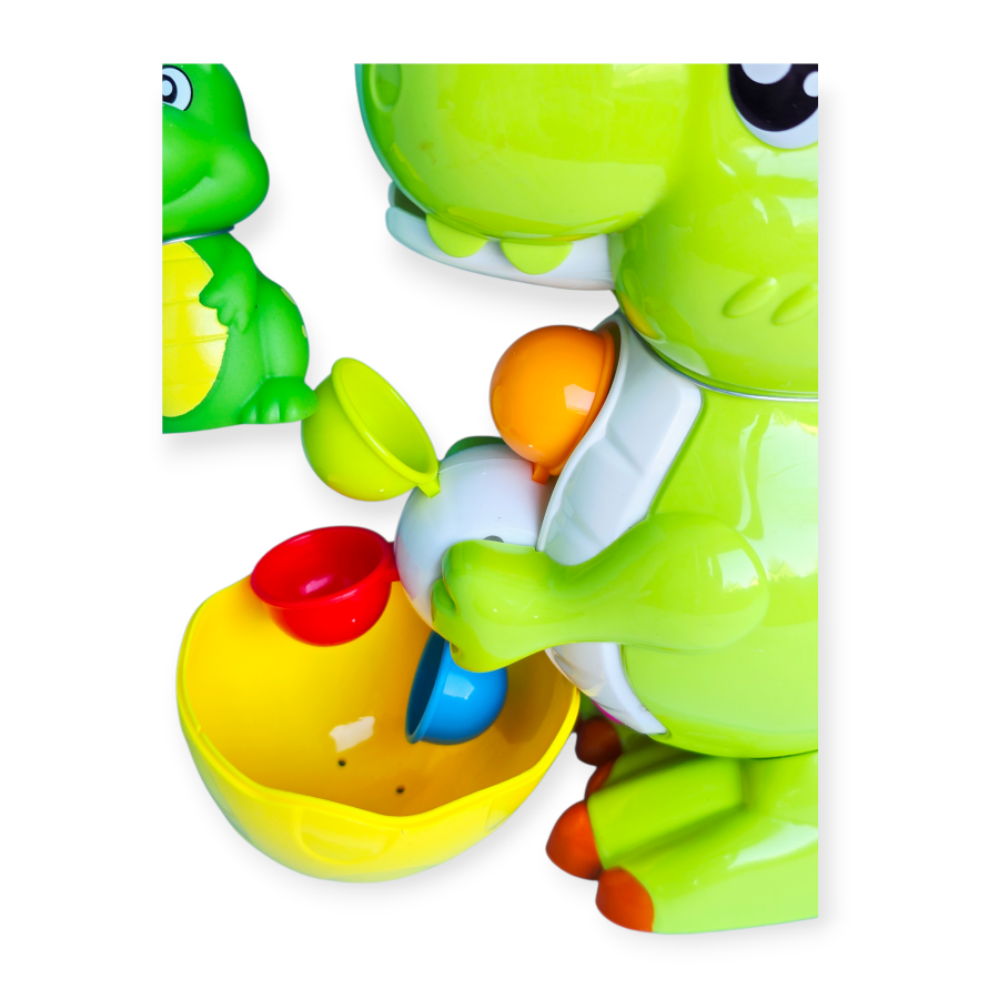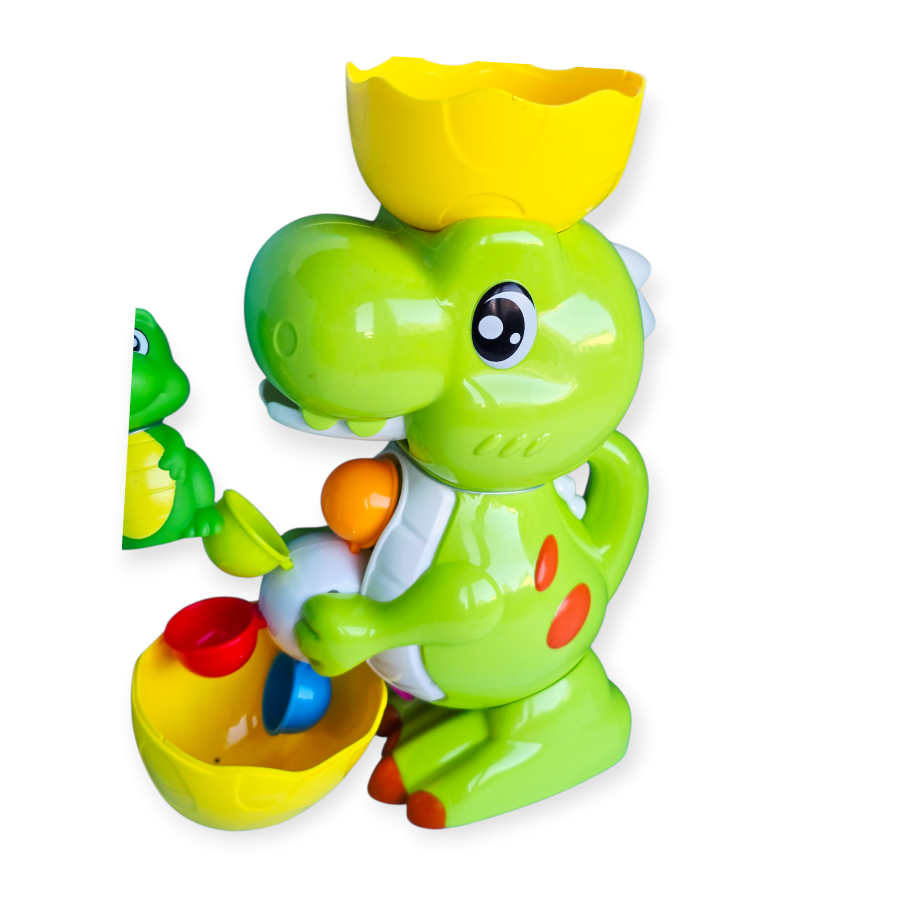Žalias dinozauras taip pat turi savo mažylį, su kuriuo jūsų mažylis gali žaisti vandenyje. Tiesiog pasemkite vandens ir supilkite jį į kiaušinio lukšto pusę ant dinozauro galvos. Vanduo ištekės pro dinozauro burną ir tada tekės žemyn per spalvingus ratelius, juos pajudindamas.